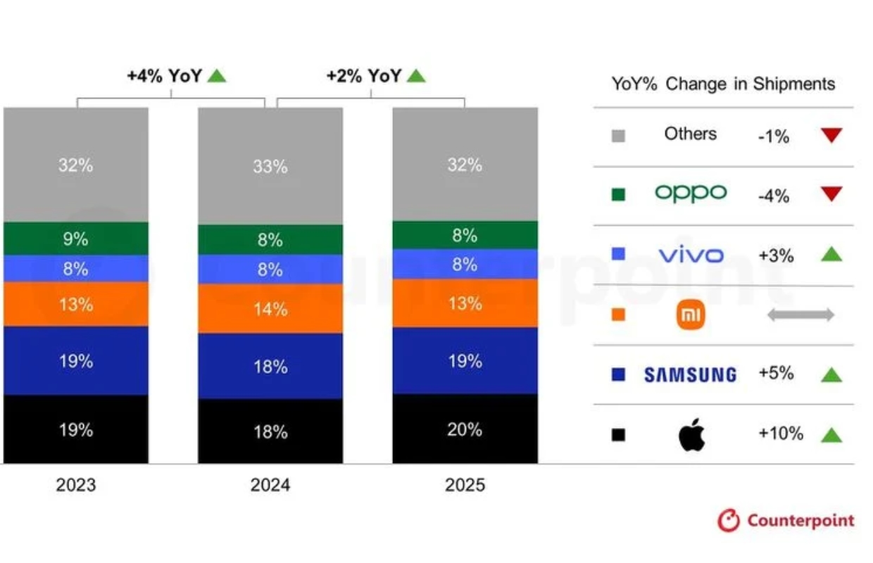 The iPhone 17 series became very popular in the fourth quarter and at the same time the iPhone 16 continued to perform exceptionally well in Japan, India and Southeast Asia. Furthermore, the pandemic-era upgrade cycle reached a tipping point in 2025, leaving millions of users in need of smartphone replacement. According to Counterpoint, Apple accounted for a quarter of global shipments in the fourth quarter of 2025, its highest quarterly share ever.
