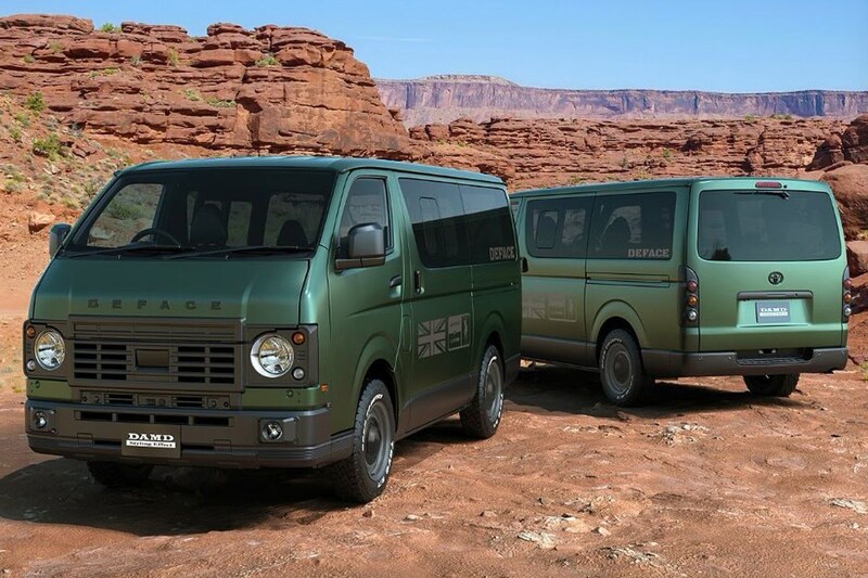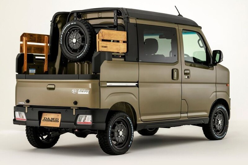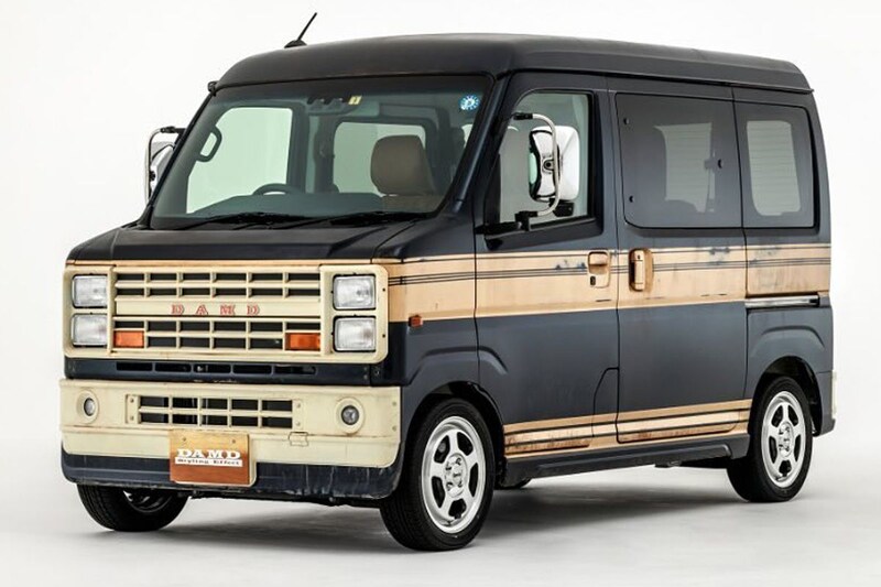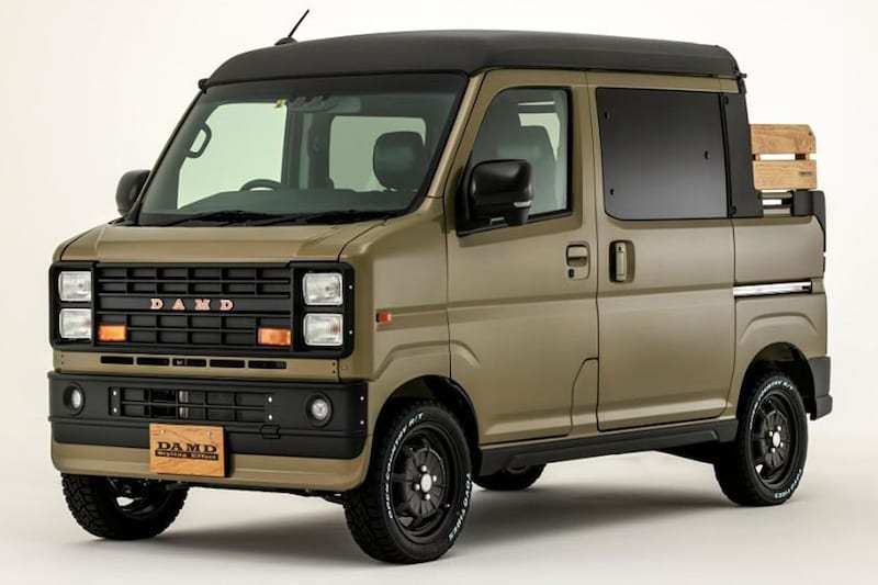 Damd has been busy and can’t keep up with the two Jimnys. For example, the Toyota Hiace van gets the Defender treatment and Damd hoists two small Daihatsu Atrai vans in an American-looking retro jacket. Nice though!