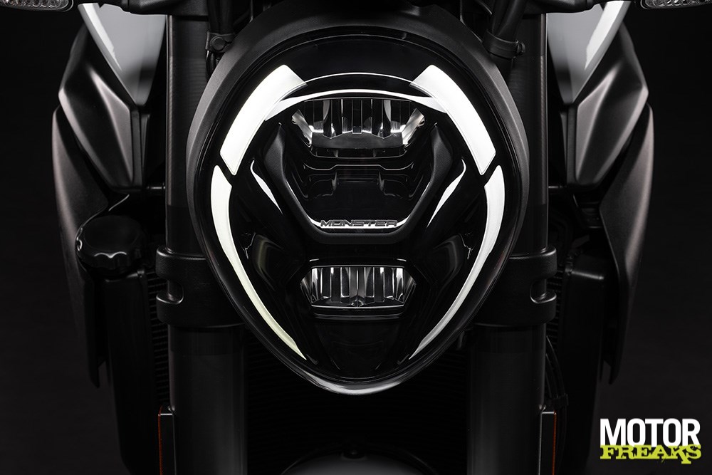 The design of the new Monster is a fresh interpretation of the classic lines, but with a modern twist. The compact, sporty shapes refer to the first model from 1992, with the characteristic bison-back tank, short, light rear and the single saddle. The front is dominated by a full-LED headlight with double ‘C’ shape and two cut-out side pieces that give a subtle nod to the Panigale V4. Ergonomics have been improved with a 5mm lower seat (815mm), giving riders easier access to the ground and efficiently removing hot air from the radiator for greater comfort.