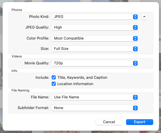 Photos Takeout is a macOS app for exporting photos and videos from Photos on Mac as well as iCloud Photos libraries. It exports everything in original format and resolution into folders by year, date or album. The export option panel also offers some other selectors, e.g. to keep or remove metadata, preserve any custom arrangement of photos in albums, etc.