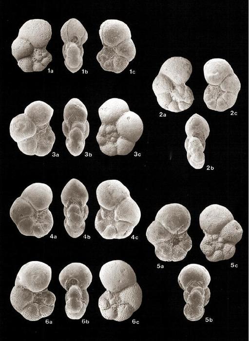 These are shells of single-celled organisms the size of a grain of sand. They are five different copies, each in three views. Numbers 1-3 are bowls of the species Globanomalina chapmani. Numbers 4-6 are representatives of Globanomalina luxorensis, a species that evolved from the other species some 55 million years ago. The differences are minimal, but striking for the connoisseur. The evolution of such small organisms may not be that spectacular, but it can be documented very accurately and thus one of the many proofs of evolution.