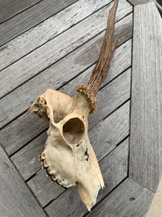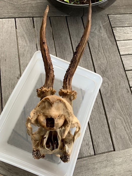 The skull you found is one of a male roe deer, a buck. Judging by the antlers and the brown color of the teeth, it was an adult deer (at least a few years old). Based on the length of the antlers, which can grow to a maximum of 25 cm, you can estimate his age when he died. For that you have to measure the antlers. The closer to the maximum height, the closer to the maximum age (average 8 to 10 years). The number of branches also says something about the age, they can have up to 5 branches in old animals (maximum 25 years)