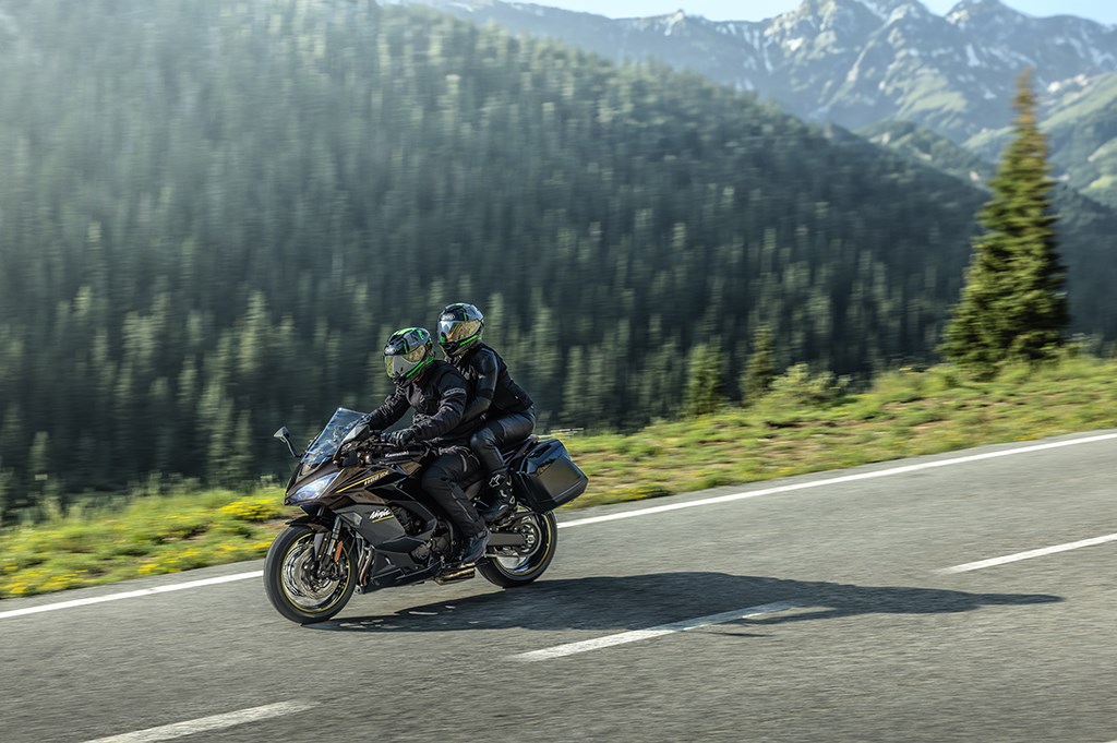 For those who want that little bit extra, there is the Ninja 1100SX SE. This special version is distinguished by an Öhlins S46 rear shock absorber with adjustable spring preload, Brembo brake calipers with steel-braided brake lines and standard grip heating. These upgrades take the driving experience to an even higher level, with more precise control, improved driving comfort and a more luxurious finish.