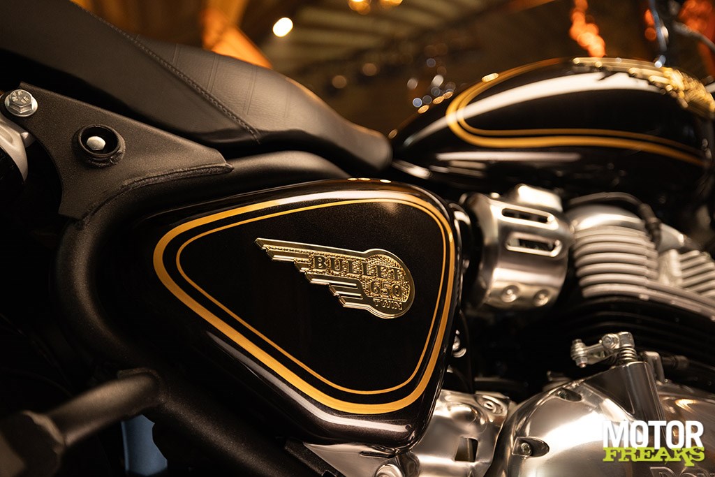 The new Bullet 650 combines classic styling with modern technology. The proven tubular steel frame forms the backbone, while details such as shiny hand-painted pinstripes, the iconic tiger lights, the vintage winged 3D badge and an upright riding position retain all the signature Bullet elements. Every part breathes the DNA of a legend, from the vintage bench seat to the traditional nacelle, ensuring the bike retains its authentic silhouette.
