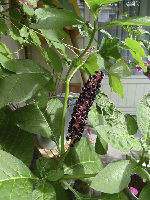 This is an Oriental Crimson Berry (Phytolacca acinosa Roxb.), easily identified by the fruit with eight loose carpels. The fruits are eaten by birds and are spread very easily in this way, so that the plant often establishes itself in gardens. Origin: China.