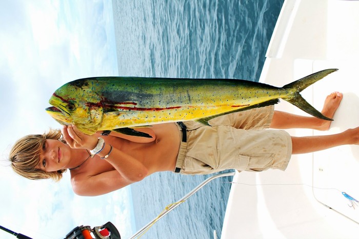 This is a photo of a golden mahi (Coryphaena hippurus). The fish is also called dolphin fish in Dutch or sometimes ‘mahi-mahi’ – after its Hawaiian name meaning ‘strong-strong’.
