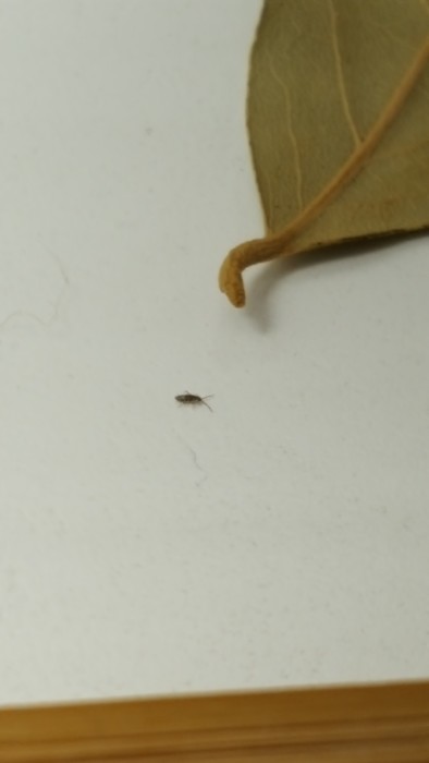 I’m in my kitchen with insects, no bigger than a pinhead, 2 feelers and they jump away when you destroy them. They mainly appear in the morning and evening. What are they and how do I get rid of them? What is an effective way (the bay leaf in the photo is an indication).