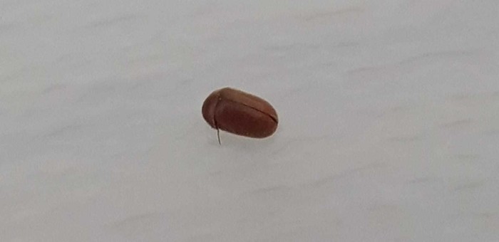 A second possibility is the bread beetle Stegobium paniceum. These beetles are classically found in all kinds of foodstuffs such as biscuits, bread, stock cubes, rusks, macaroni, pasta, grain, flour, … But also dog food, bird seed, leftover bean seeds in the attic, a bird’s nest under the gutter, … are at the root of the problem. We have even found the beetles and the larvae in a cherry pit cushion. Both beetle species tend to fly towards the light (window).
