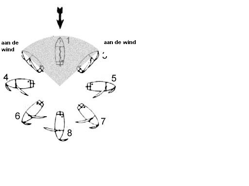 PS. When the boat has a speed you have to look at how the wind is blowing relative to the boat and this determines the direction of the lift and the aerodynamic drag force. eg. in situation 8, if you go as fast as the wind, it becomes relatively calm. Then there is no longer any force that drives the boat and so the speed of the boat decreases due to the resistance of the water. So you can never go as fast as the wind in that direction. If you sail diagonally to the wind, the relative direction from which the wind is blowing changes. The faster you go, the more relative headwind you will get. However, as long as the relative wind direction makes an angle with the sailing direction you will get a ‘lift’ force on the sail which has a component that will propel the boat. The less resistance the boat has in the direction of travel, the faster you move forward.
